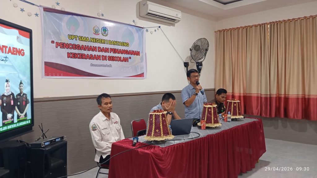 Lebih dari seratus siswa berkumpul di ruang perpustakaan SMAN 1 Bantaeng yang saat ini sementara beralih fungsi menjadi ruang pertemuan. Pertemuan yang tidak sebagaimana biasanya, kali ini khusus perbincangannya seputar ketaatan terhadap hukum. Sekolah mengemas kegiatan tersebut tema “Pencegahan dan Penanganan Tindak Kekerasan di Lingkungan Sekolah”. Kehadiran kejakasaan Negeri Kab. Bantaeng dalam satu program “Jaksa Masuk Sekolah”. Sebelum menyimak materi dari kejaksaan, terlebih dahulu kepala sekolah memberikan sambutan, sekaligus menyampaikan orintasi singkat dari kegiatan tersebut.