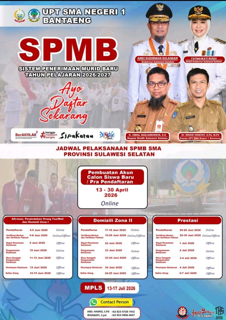 Secara resmi, dinas pendidikan provinsi Sulawesi Selatan baru akan membuka pendaftaraan online pada tanggal 4-6 Juni 2026, akan tetapi sebelum pendaftaran untuk pemilihan sekolah, maka terlebih dahulu siswa memiliki akun. Pra pendaftaran ini dibuka sejak tanggal 13-30 April 2026. Disampaikan kepada seluruh calon siswa bahwa pra pendaftaran pada laman SPMB Sulsel sudah terbuka. Seluruh calon siswa sudah bisa mendaftarkan diri di laman tersebut mulai, 16 – 30 April 2026. Silahkan mendaftar secara online pada Link spmb Sulsel: https://spmb.sulselprov.go.id . Demikian keterangan ibu Irnawati Amir, salah seorang panitia yang sedang menerima berkas pendaftaran ketika penulis melakukan wawancara di posko pendaftaran SPMB SMAN 1 Bantaeng (27/4/2026).